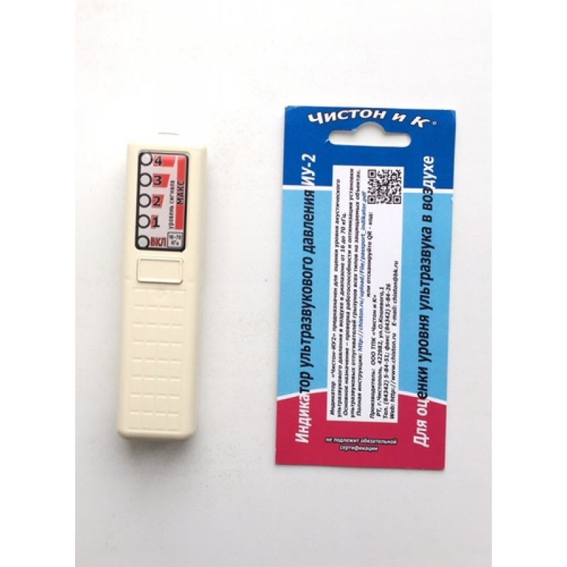 Индикатор ультразвука «Чистон-ИУ2» состоит из приёмника ультразвука, микрофона, цифрового блока обработки сигнала, индикатора результатов измерений и источника питания, смонтирован в удобном пластмассовом корпусе с батарейным отсеком, выключателем питания, светодиодными индикаторами. Приёмник ультразвука расположен на передней грани прибора.
